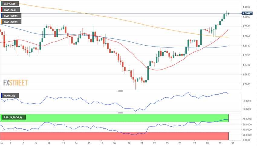 英镑/美元保持积极基调 ,接近日高 。该货币对近期处于超买状态,但可能继续上涨 。4小时图表显示20均线急剧上升,在穿过较长期均线之后仍然保持其强度。动能指标从日高回落 ,而相对强弱指数(RSI)在73附近盘整。该货币对在1.4000水平附近可能会遇到一些卖盘兴趣,不过如果该货币对明确突破该水准,则可能会向1.4200区域冲去 。