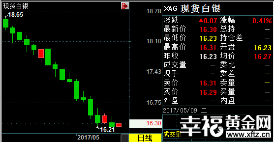 幸福黄金网05月09日讯——今日现货白银价格最新查询(2017年5月9日)参考价格:现货白银16.30美元/盎司 ,时间2017-5-9 10:35 。
